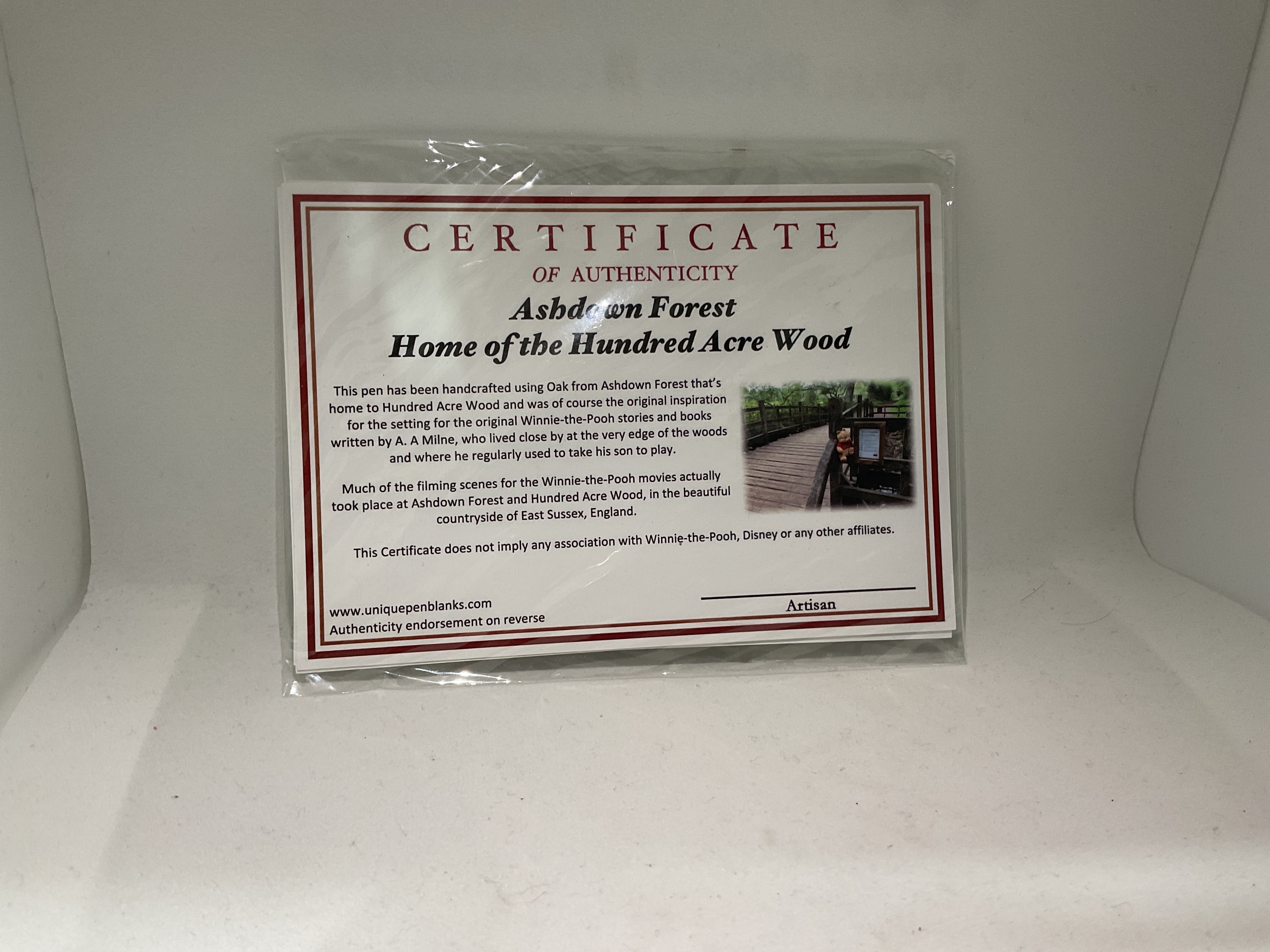 Rollerball pen, accepts Schmidt refills. Wood sourced from Ashdown forest, home of the 100 acre woods, in the beautiful countryside of East Sussex, England.