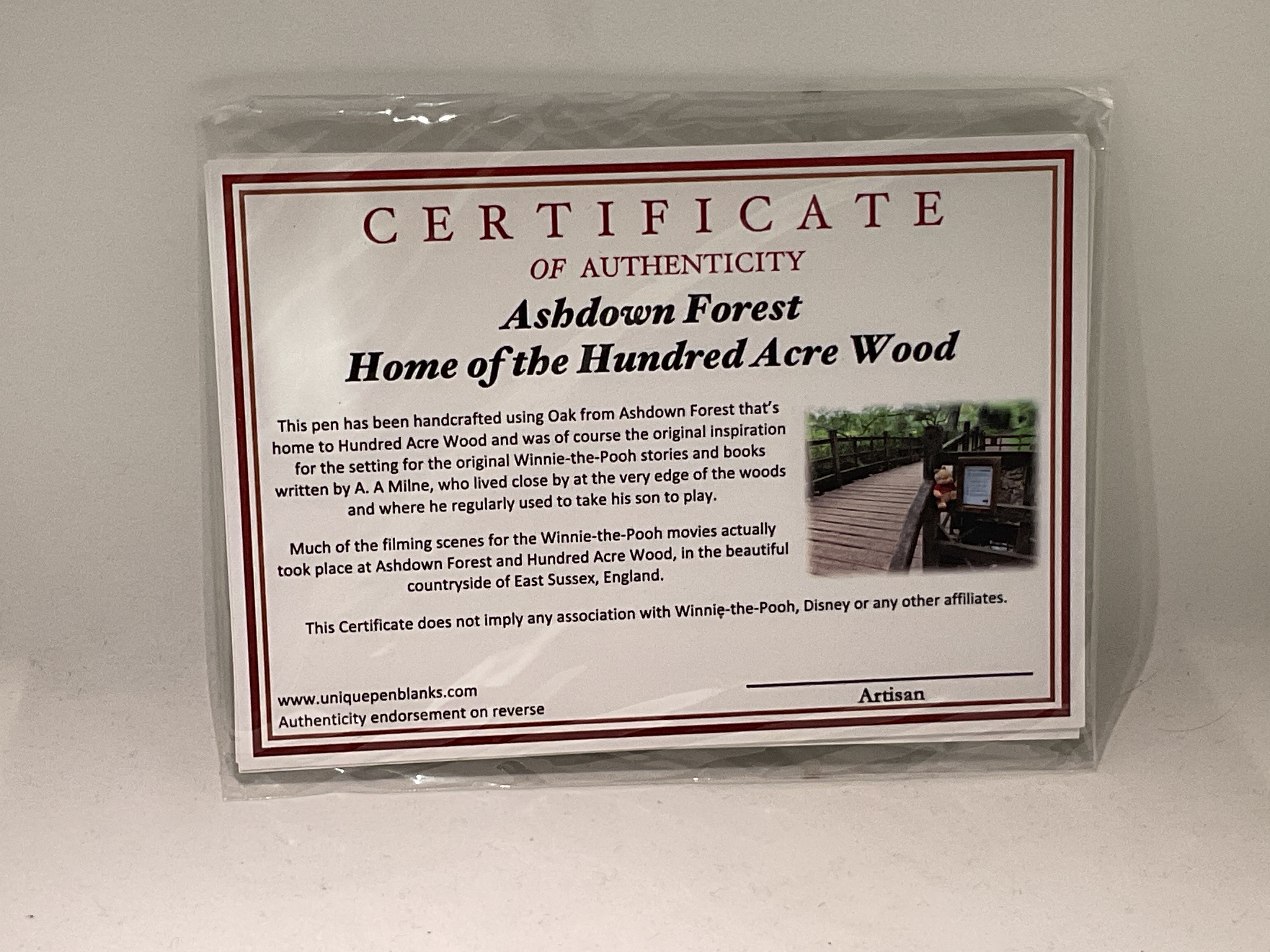 Rollerball pen, accepts Schmidt refills. Wood sourced from Ashdown forest, home of the 100 acre woods, in the beautiful countryside of East Sussex, England.