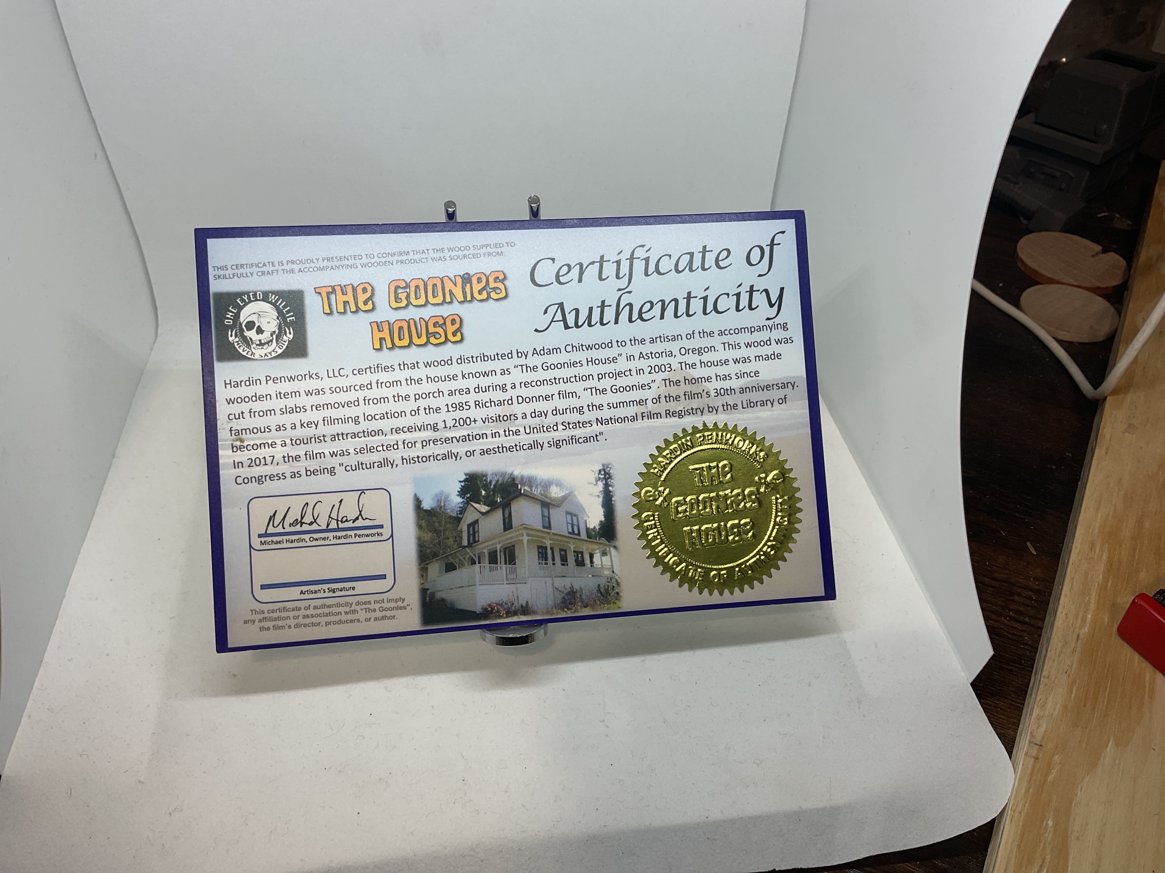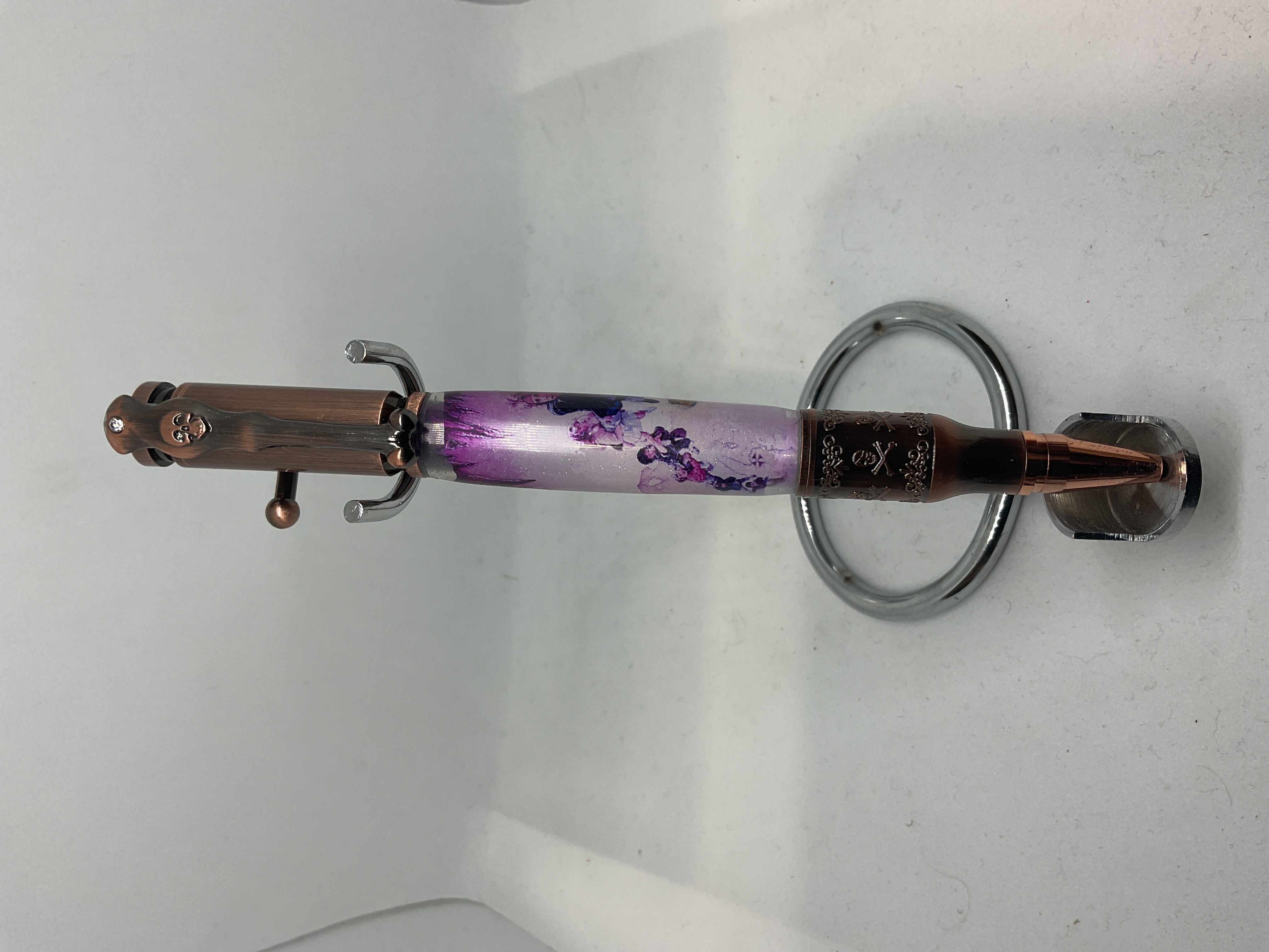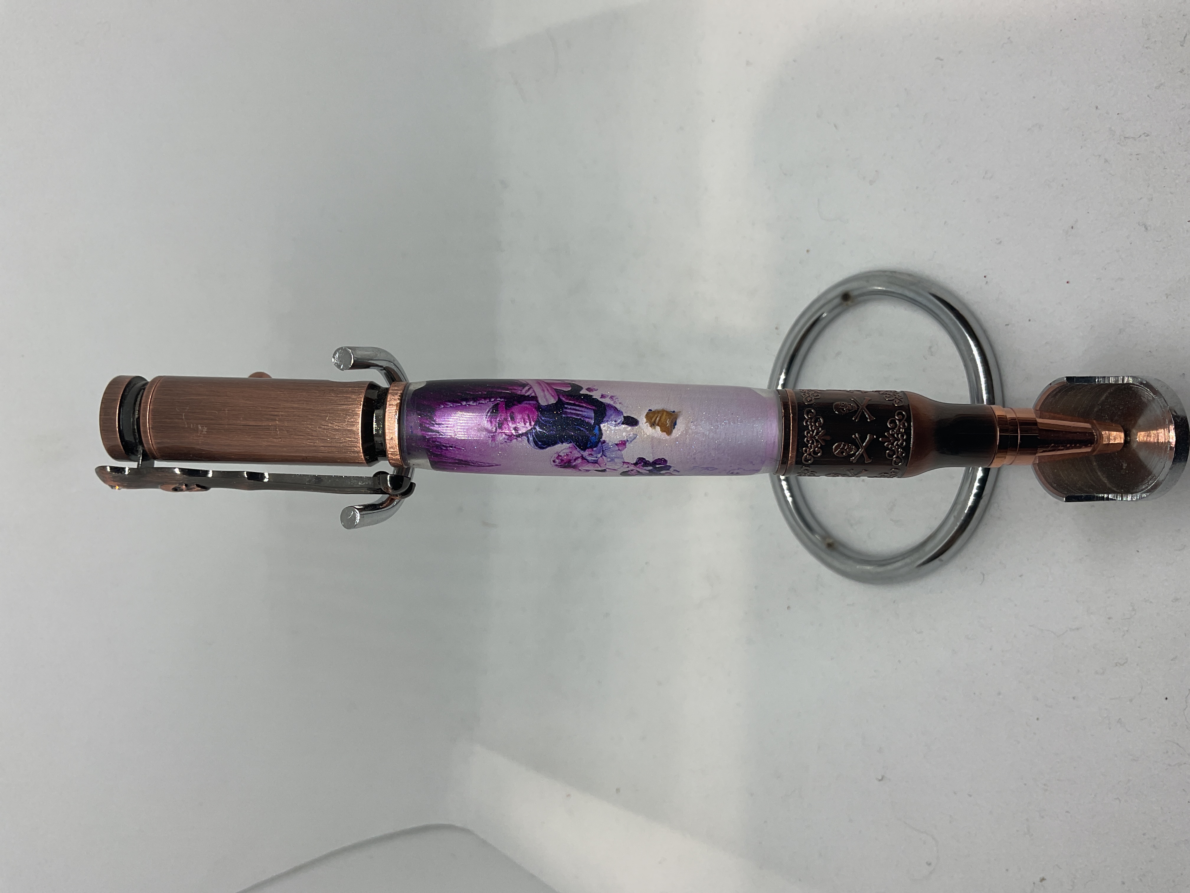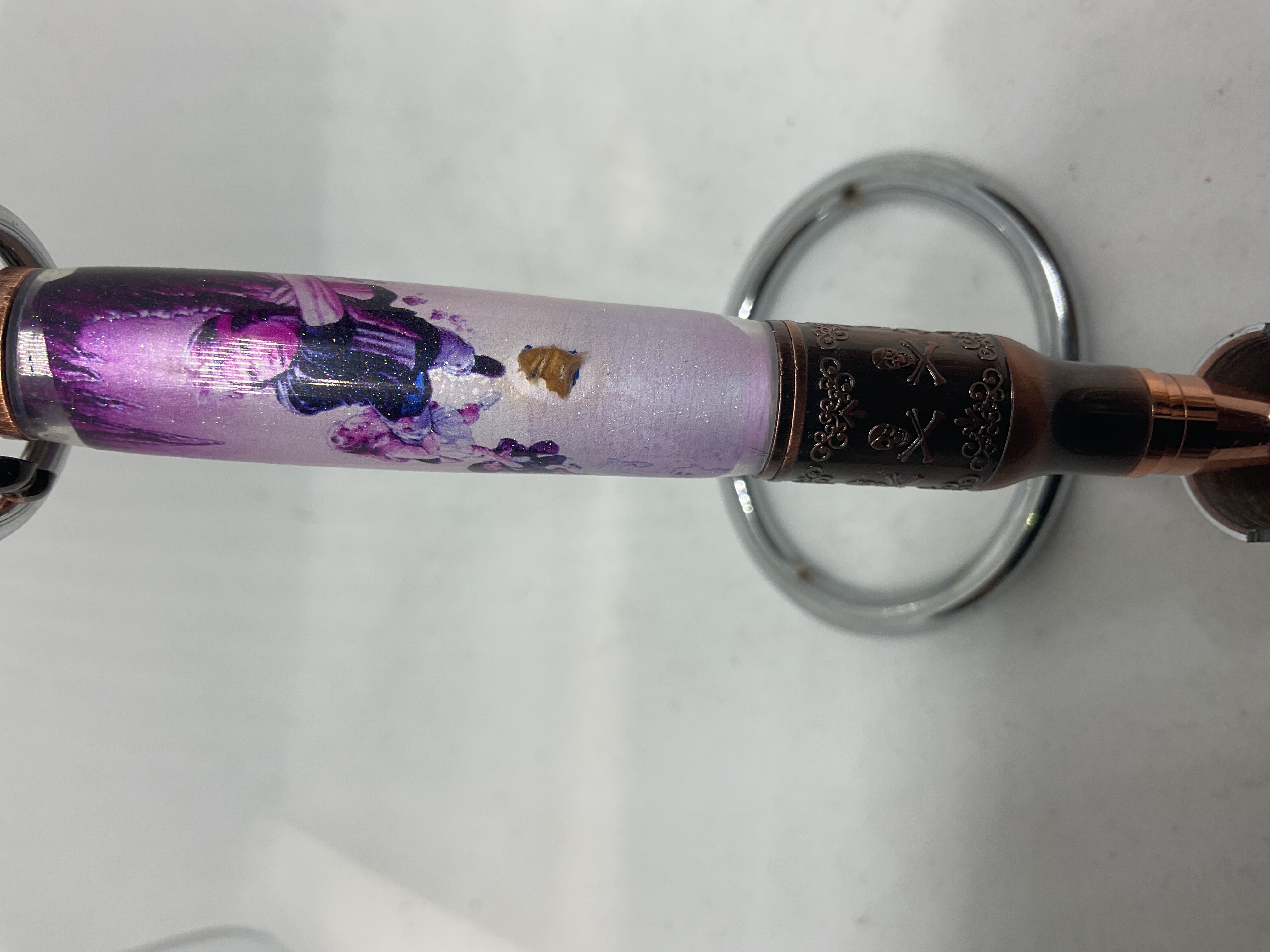 Bolt action pen with pirate theme. Made from resin and hand turned. Has image from goonies movie with wood from house embedded. Accepts Parker style refills.