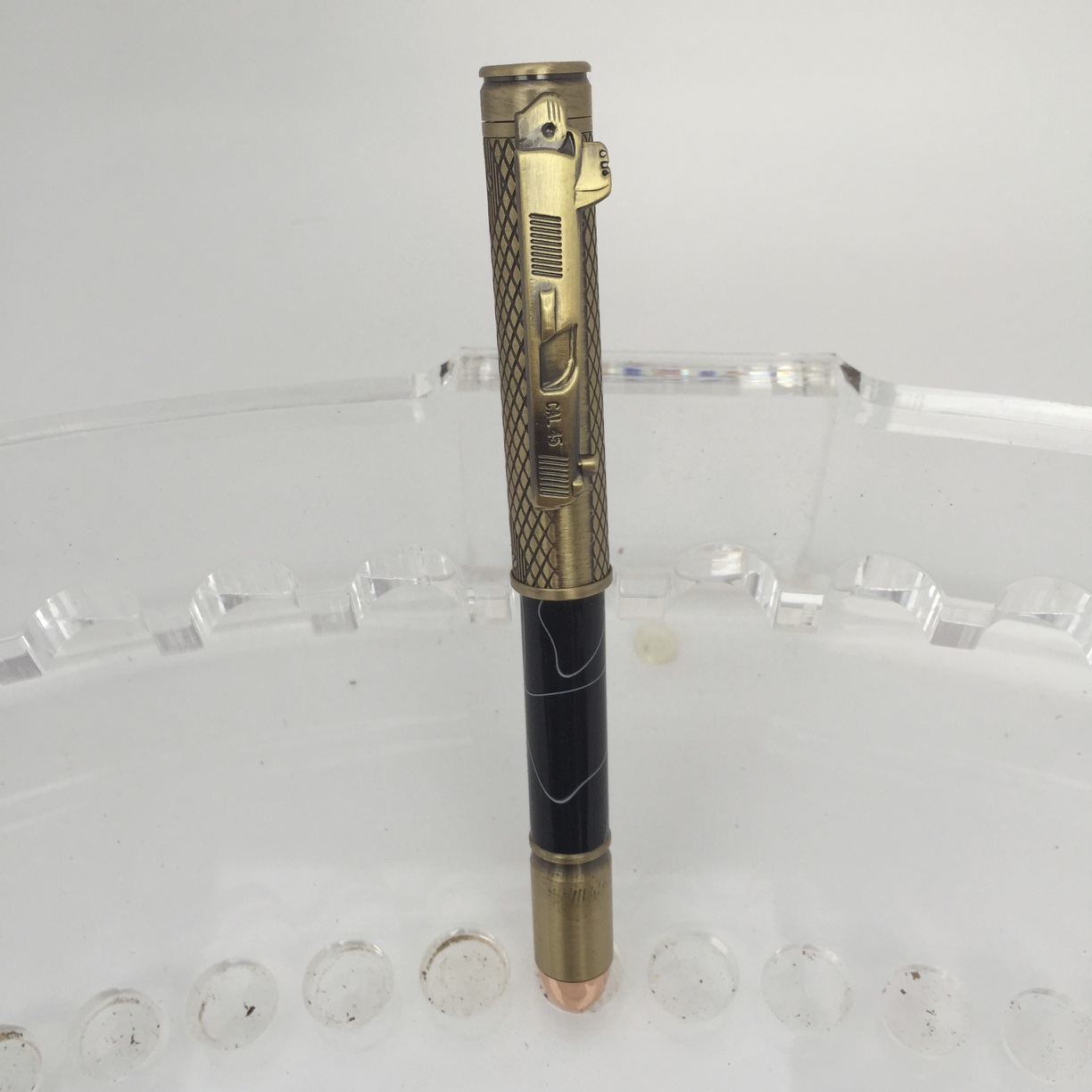 Popular pen in brass finish, click style pen, tip of pen designed to resemble .45 caliber bullet. Black with white accent acrylic. Hand turned.