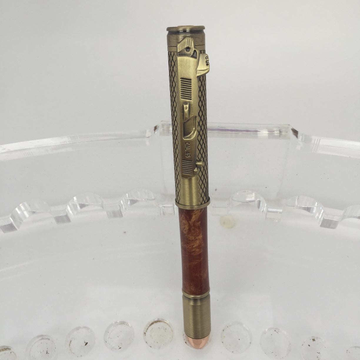 Popular pen in brass finish, click style pen, tip of pen designed to resemble .45 caliber bullet. Handmade with copper acrylic.