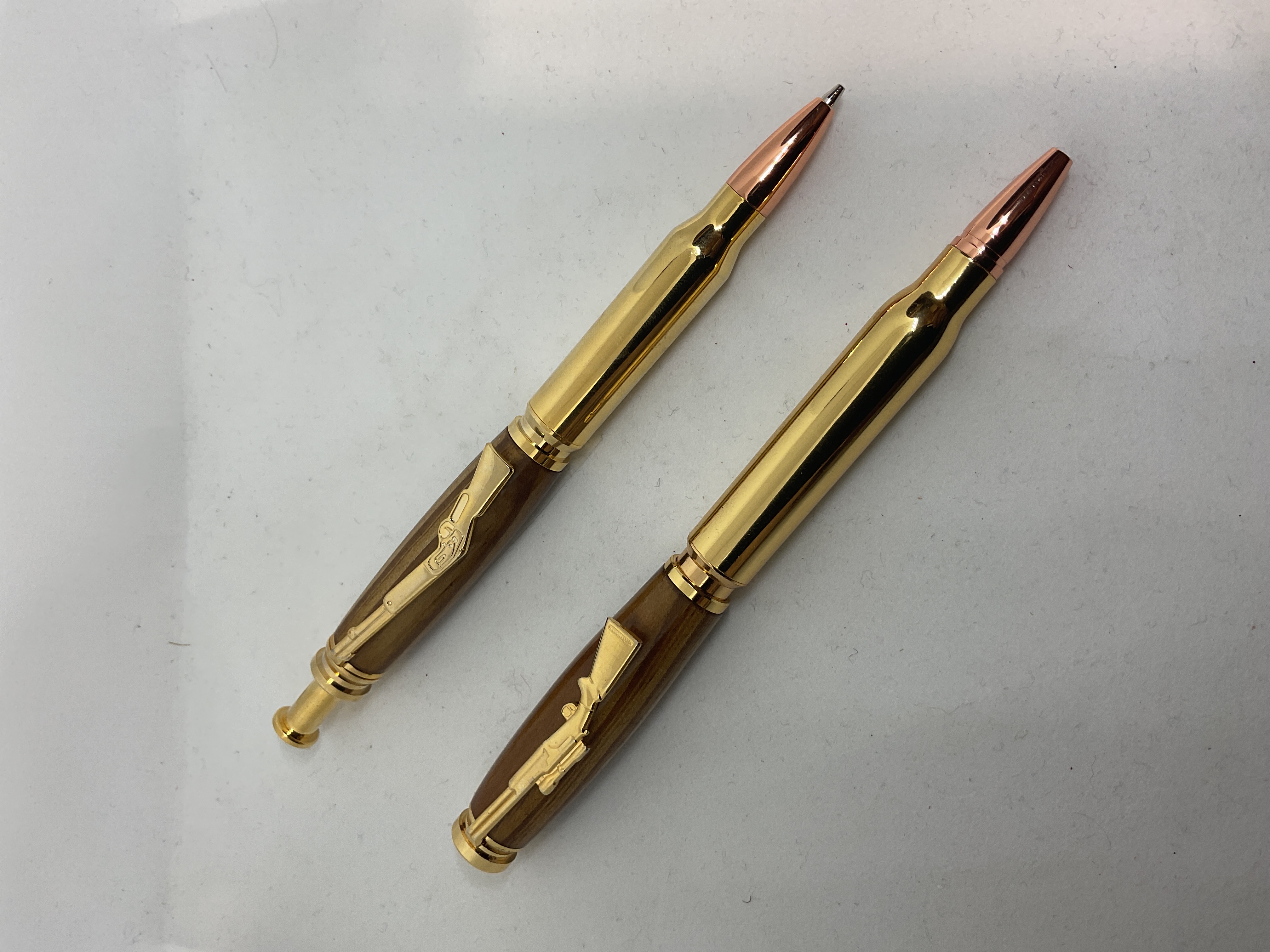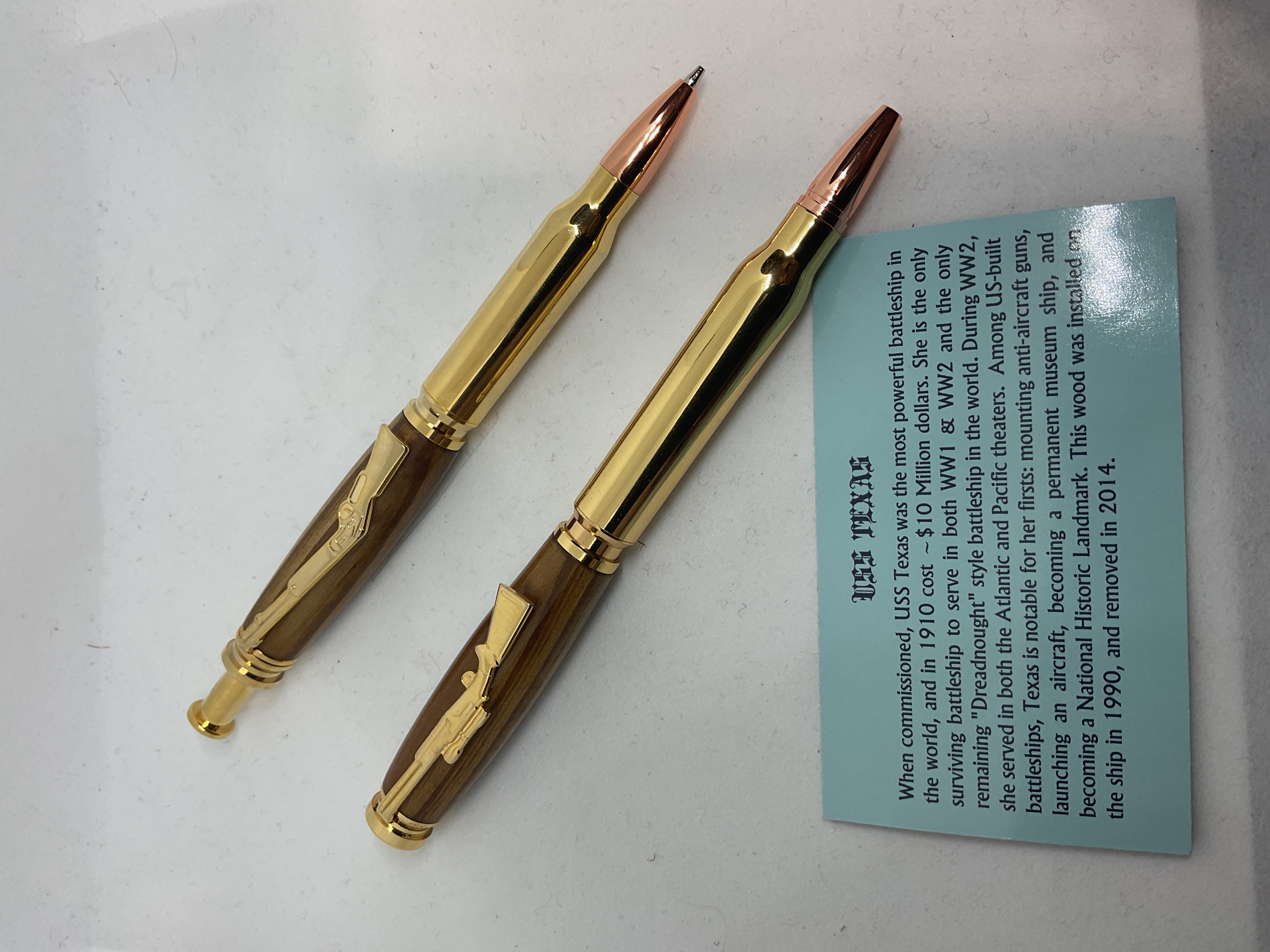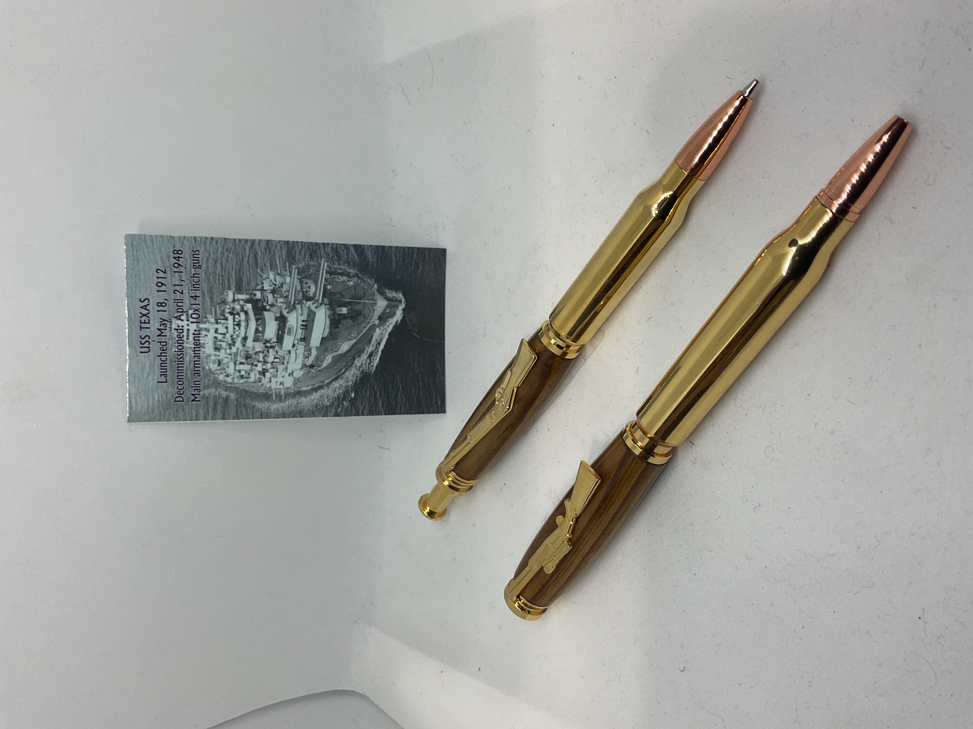 Pen and pencil set, pen accepts Parker refills and pencil accepts standard mechanical pencil refills. Bullet style set. Includes wood from battleship installed in 1990, and removed in 2014. Originally commissioned in 1910, served in WW2 on Atlantic and Pacific Front. Currently a museum.