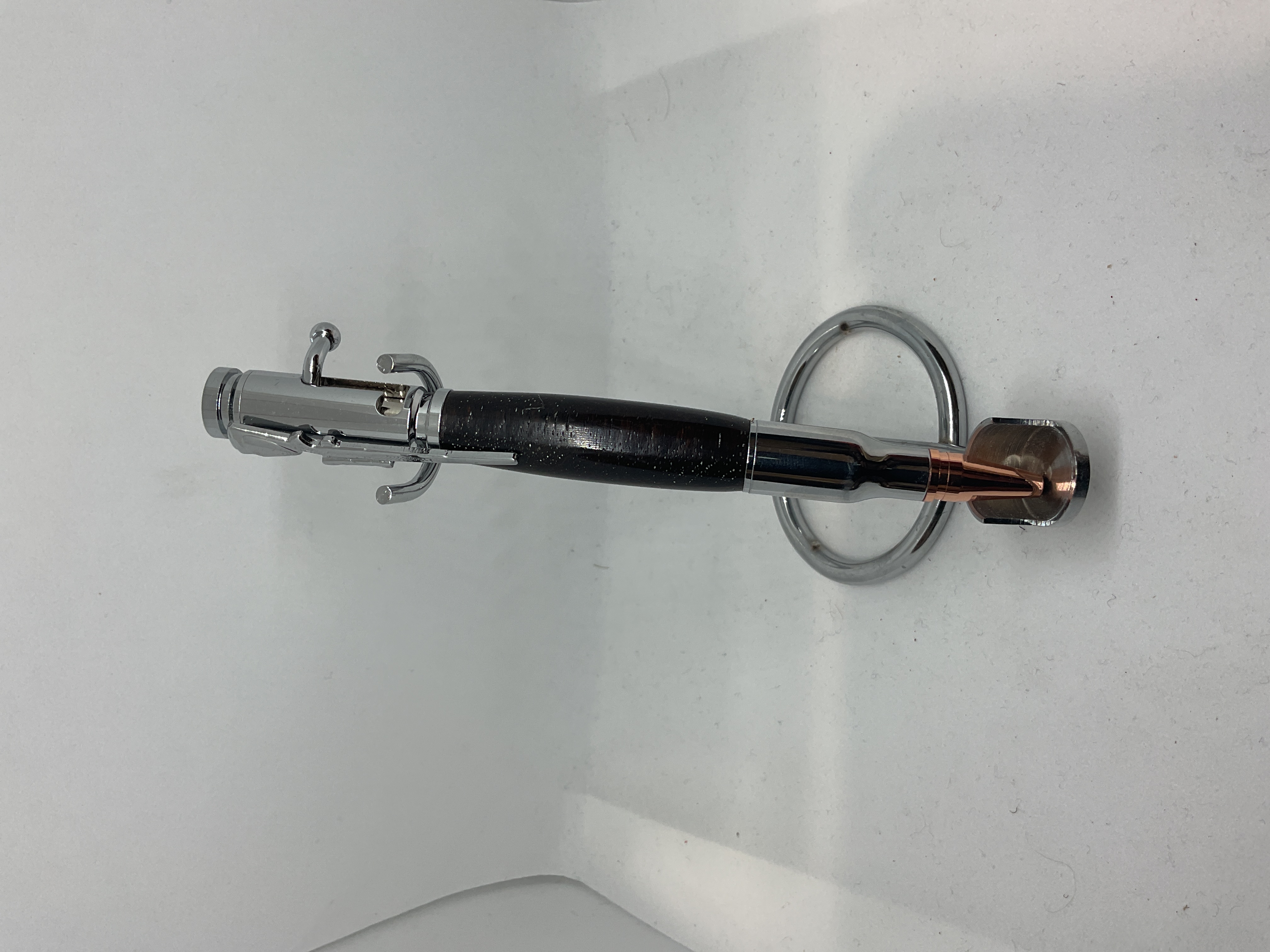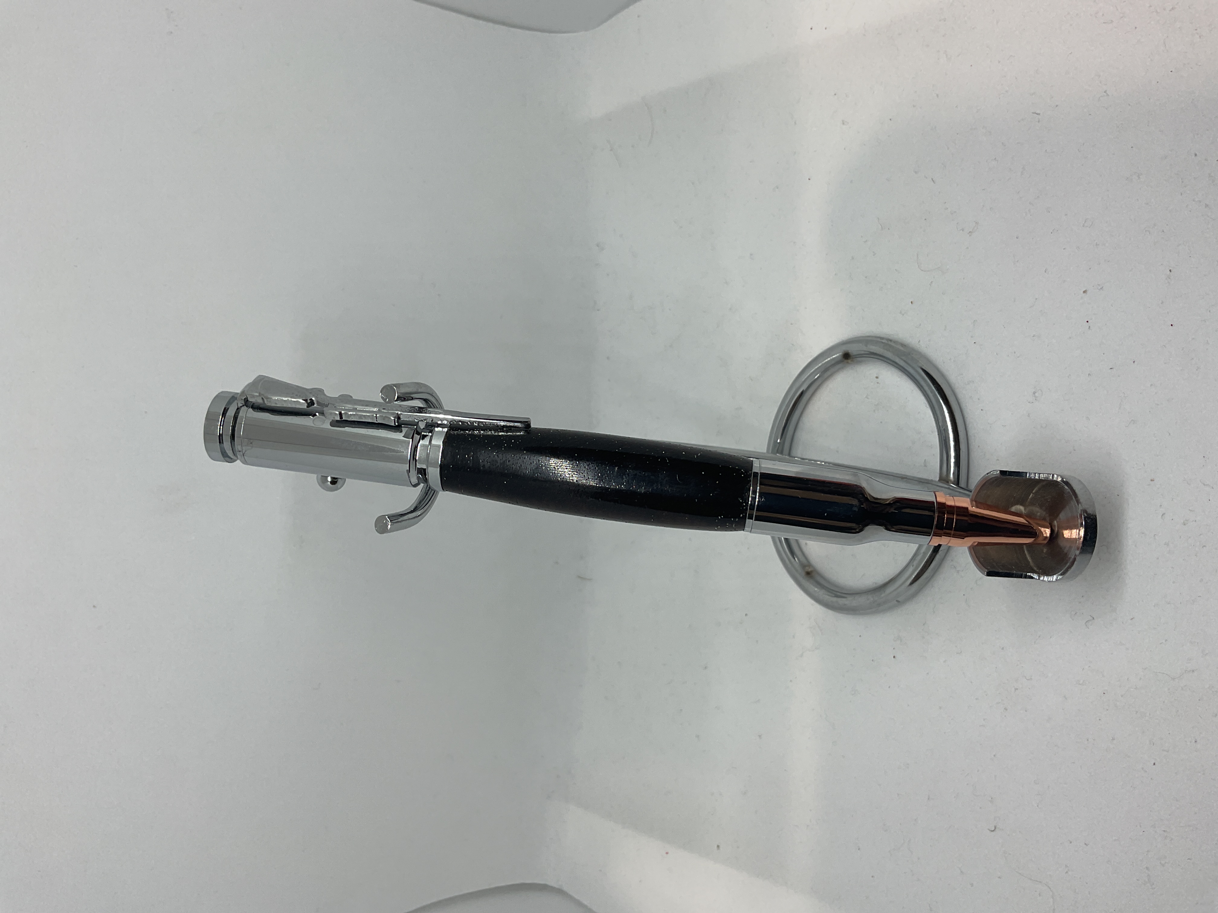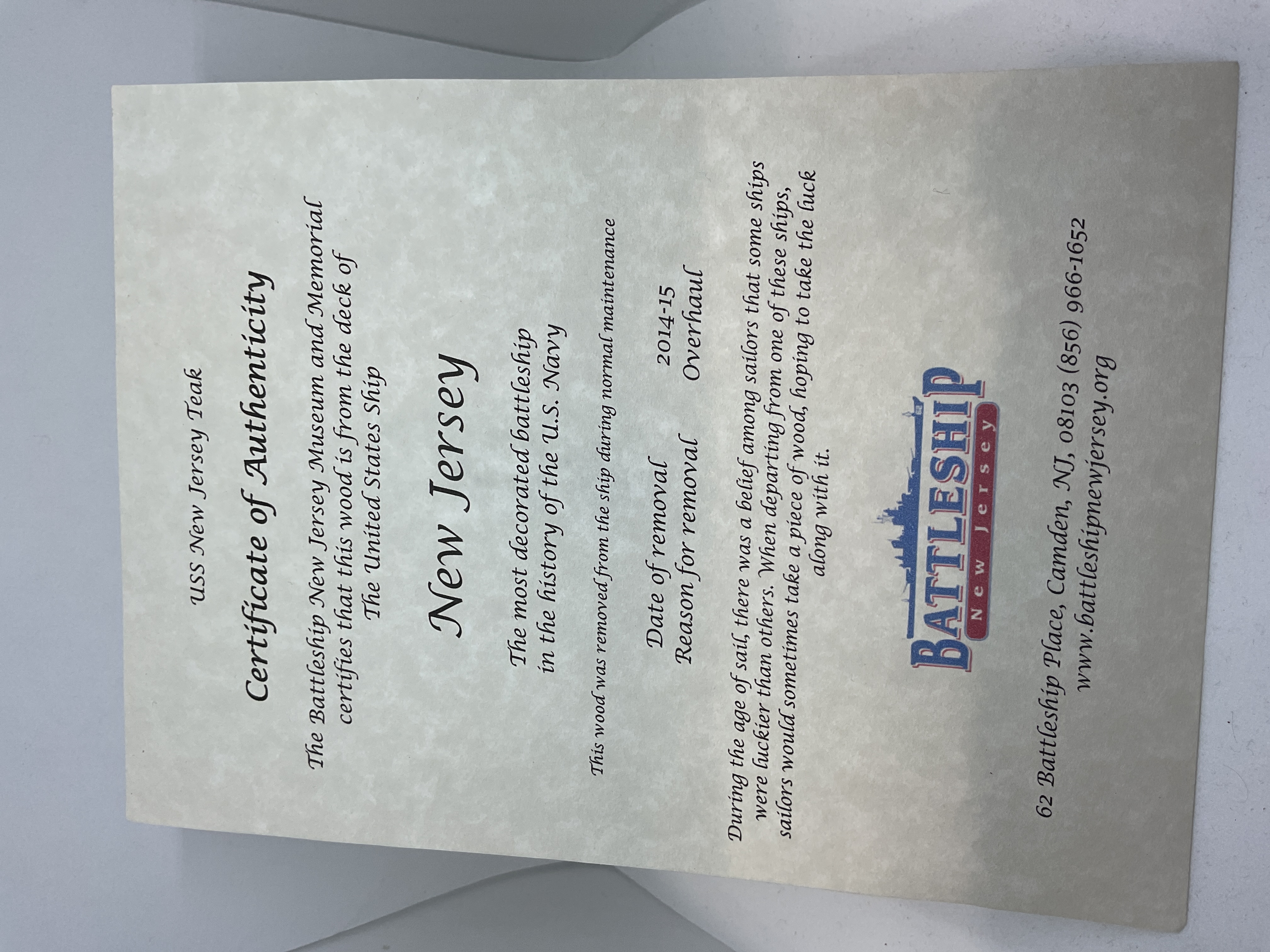 Bolt action style pen, accepts Parker refills. Made from teak wood removed from the battleship.