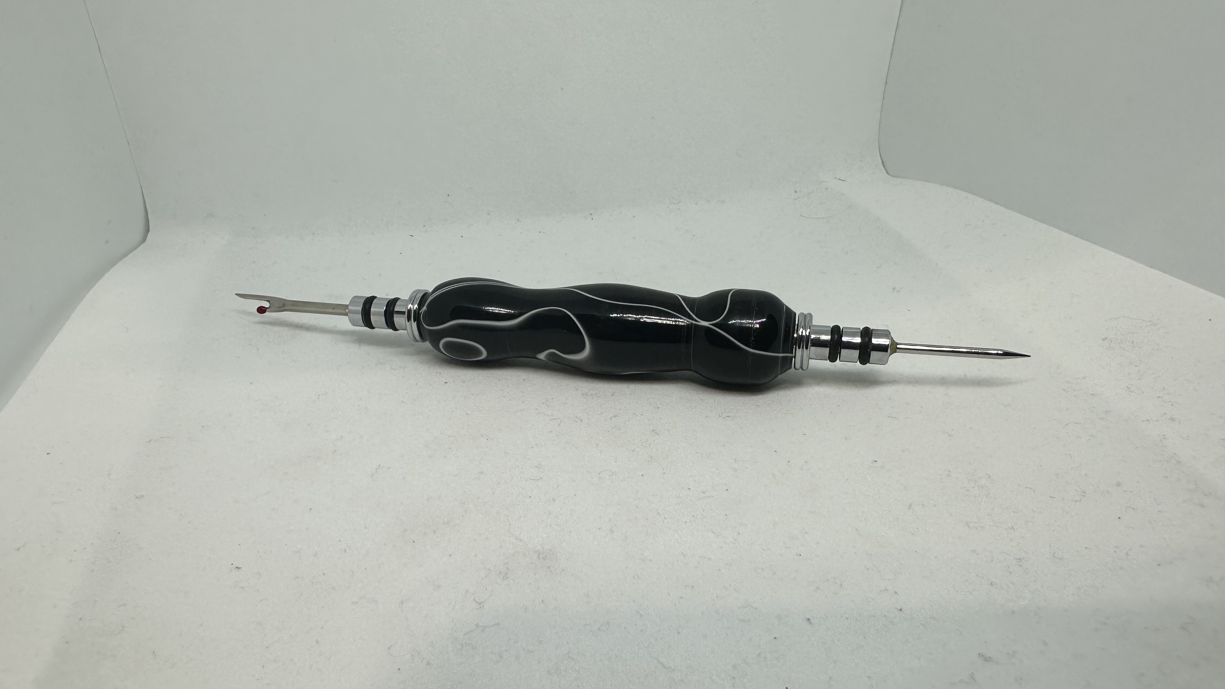 Handmade seam ripper made with acrylic resin. Black with white accent highlights and features seam ripper and stiletto attachment, which feature rubber o-rings for secure fit. Great gift for anyone who sew’s.