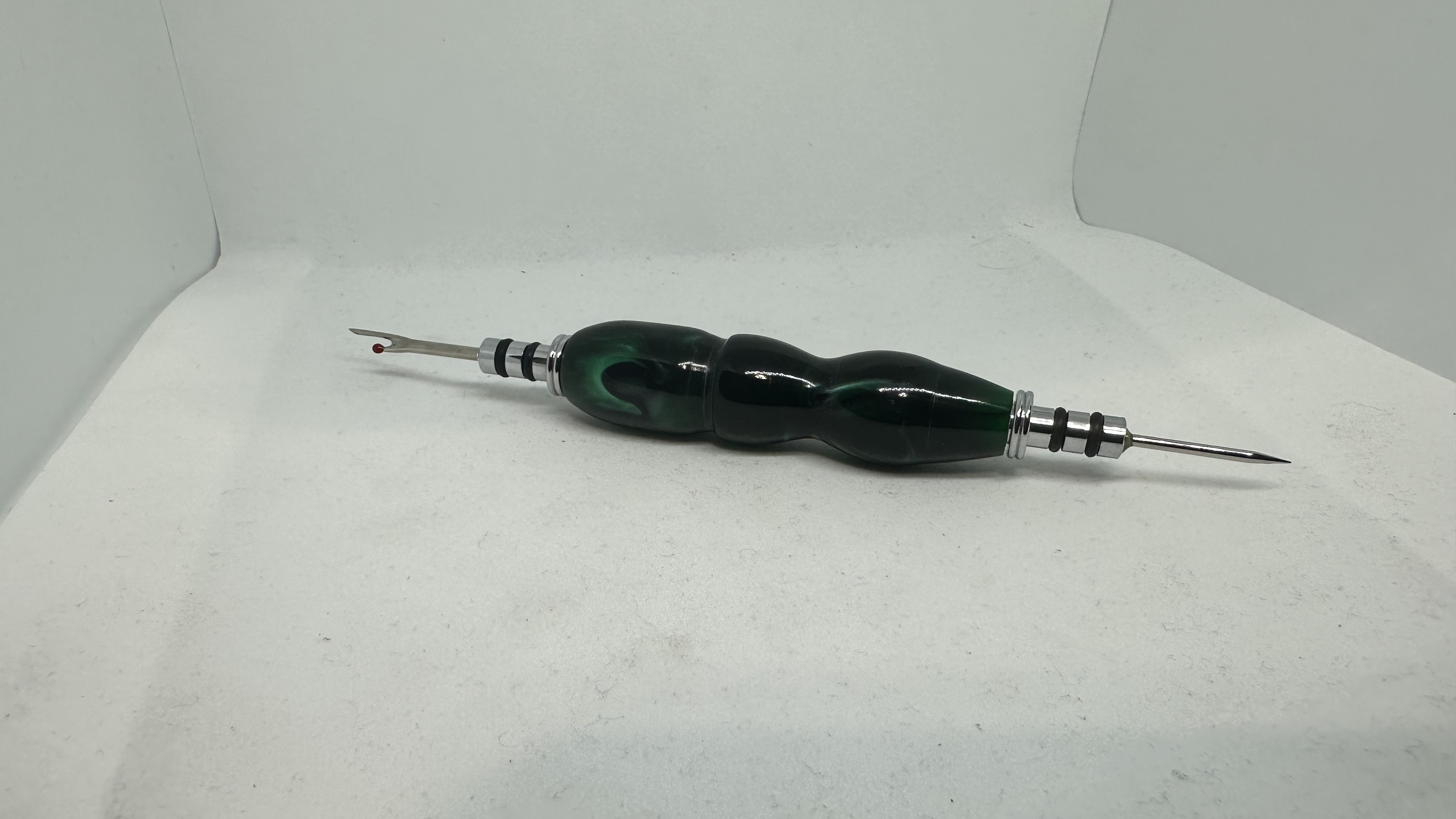 Handmade seam ripper made with acrylic resin. Green acrylic and features seam ripper and stiletto attachment, which feature rubber o-rings for secure fit. Great gift for anyone who sew’s.