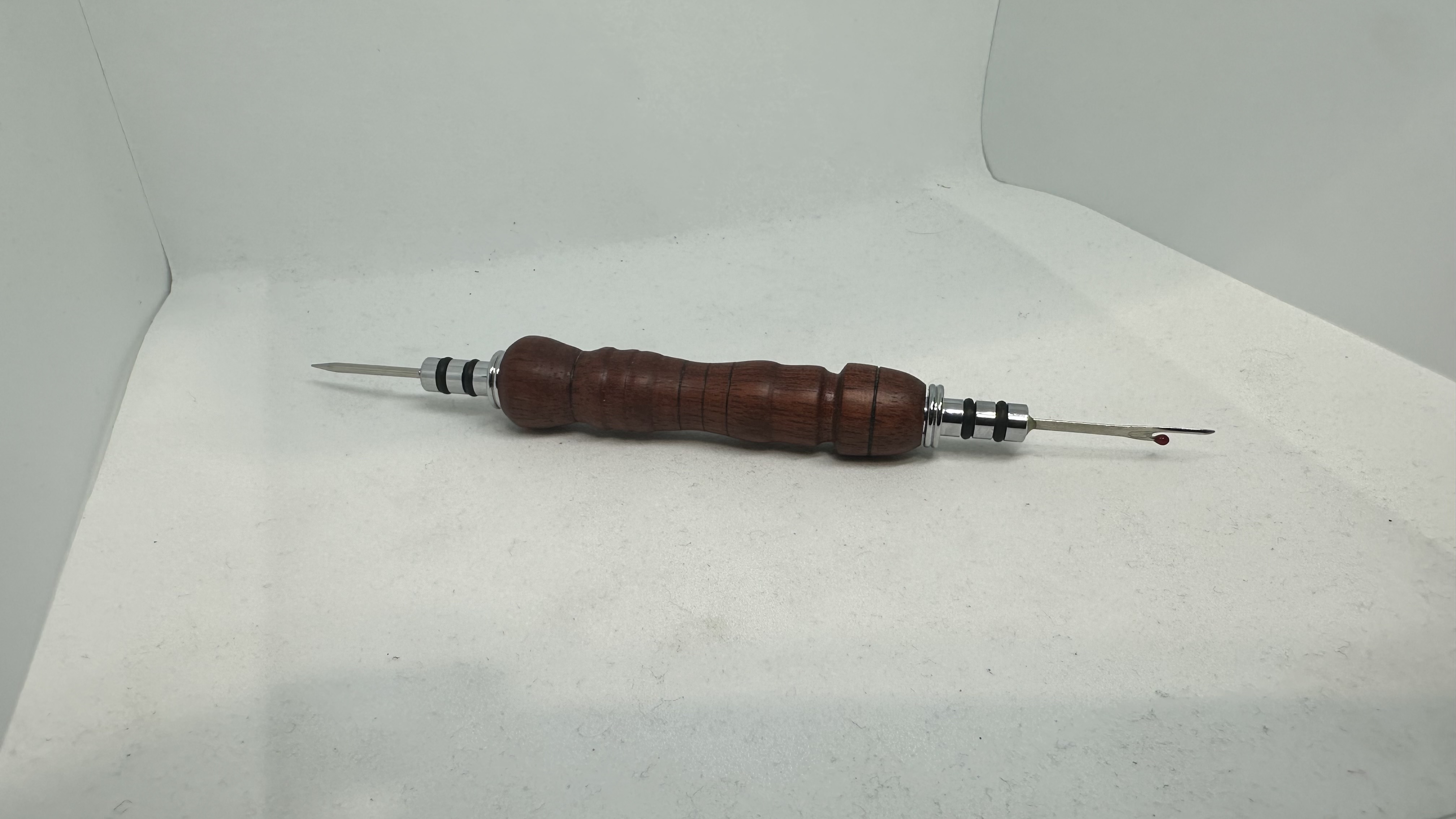 Handcrafted seam ripper. Made from hardwood and featuring a seam ripper and stiletto attachment which fit inside using o-rings to create a tight fit.