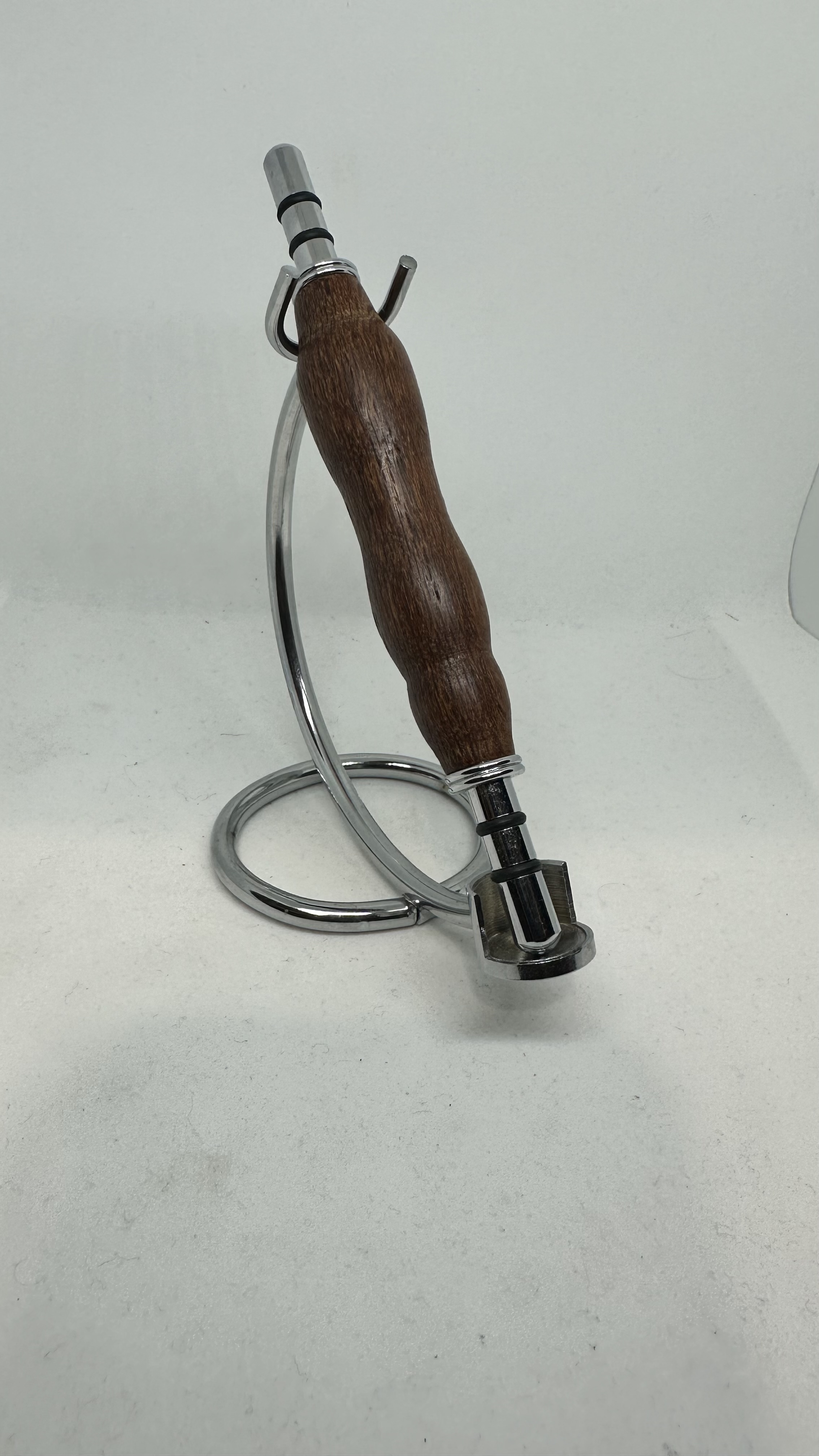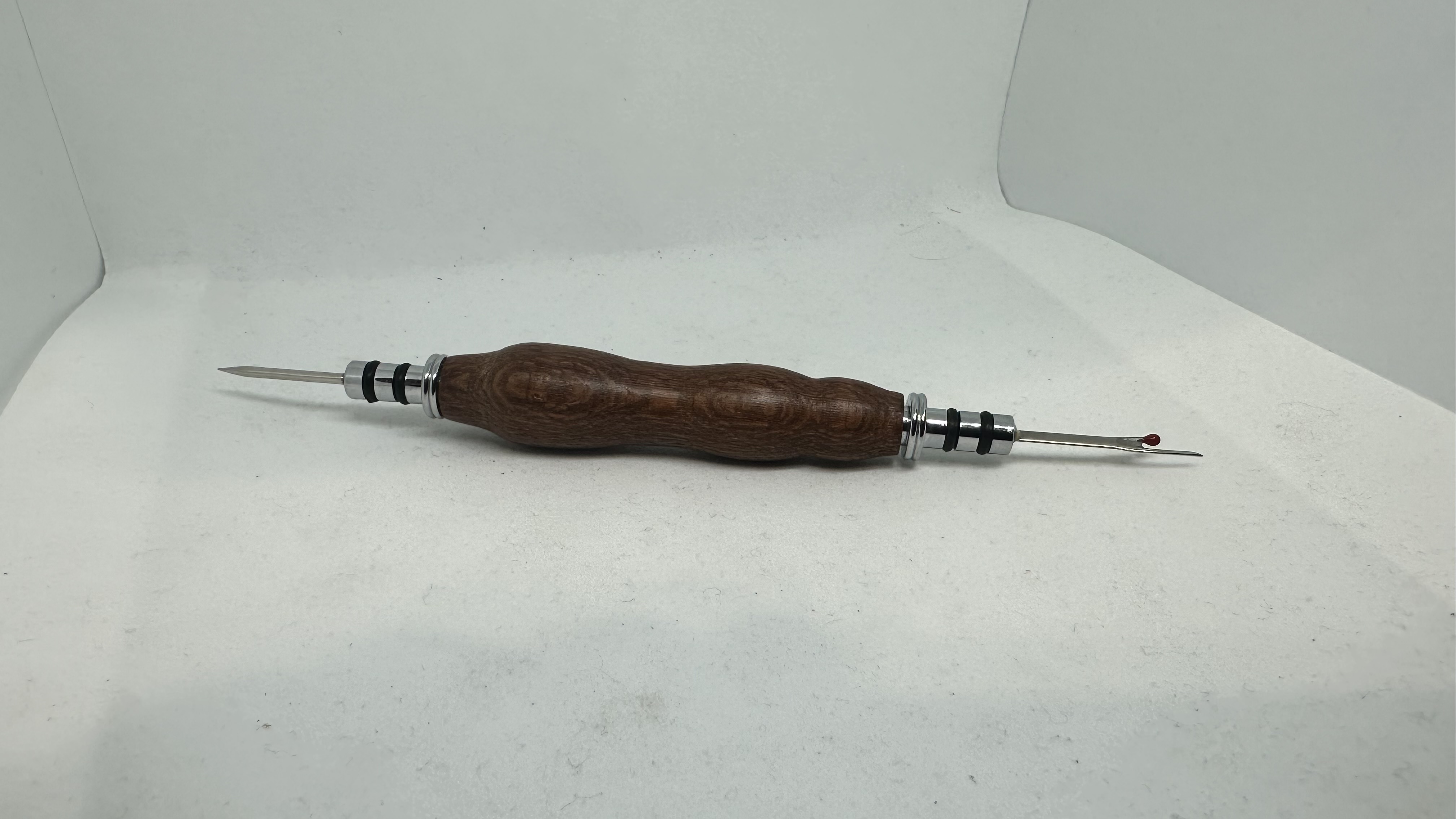 Handcrafted seam ripper. Made from hardwood and featuring a seam ripper and stiletto attachment which fit inside using o-rings to create a tight fit.
