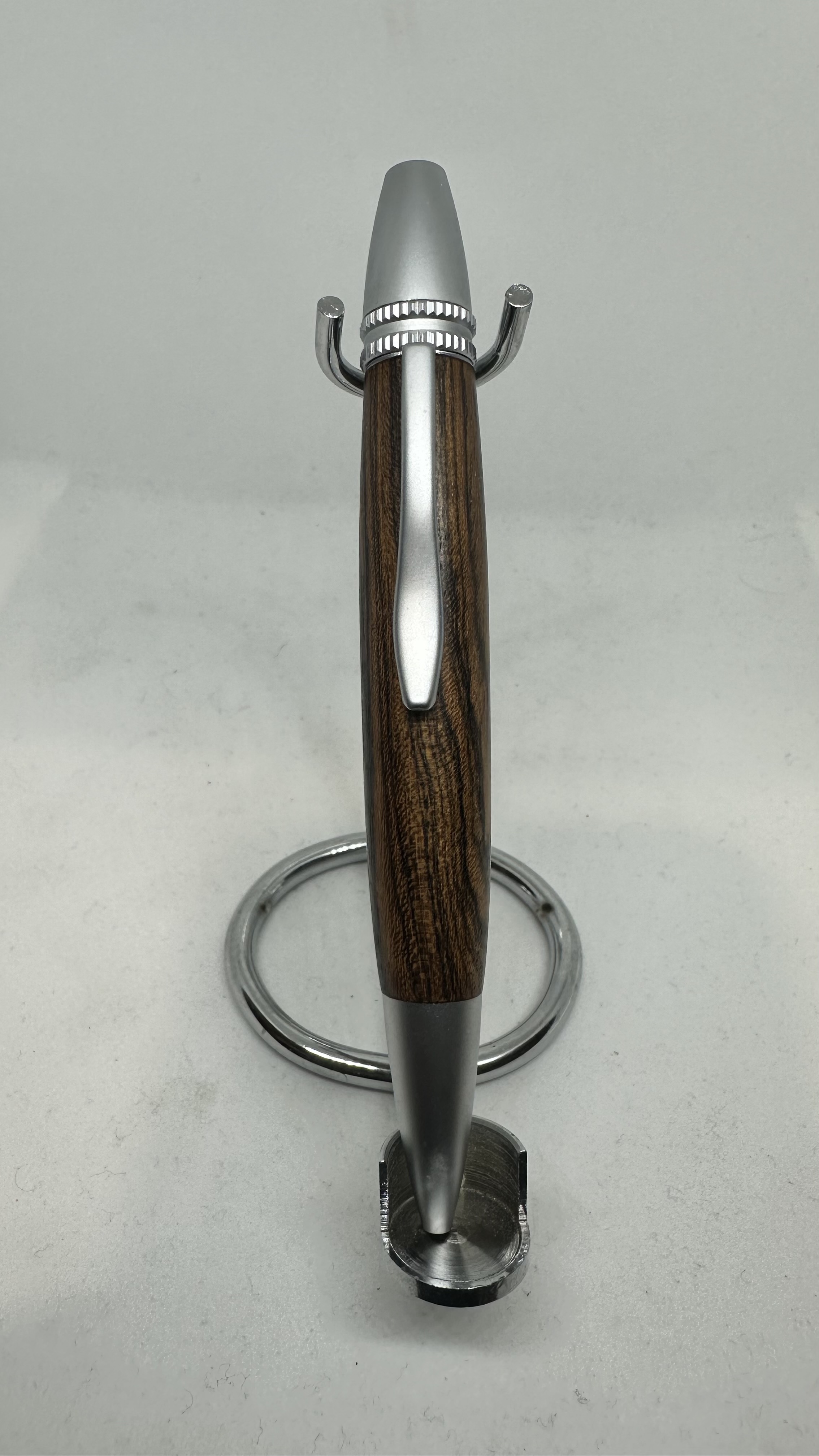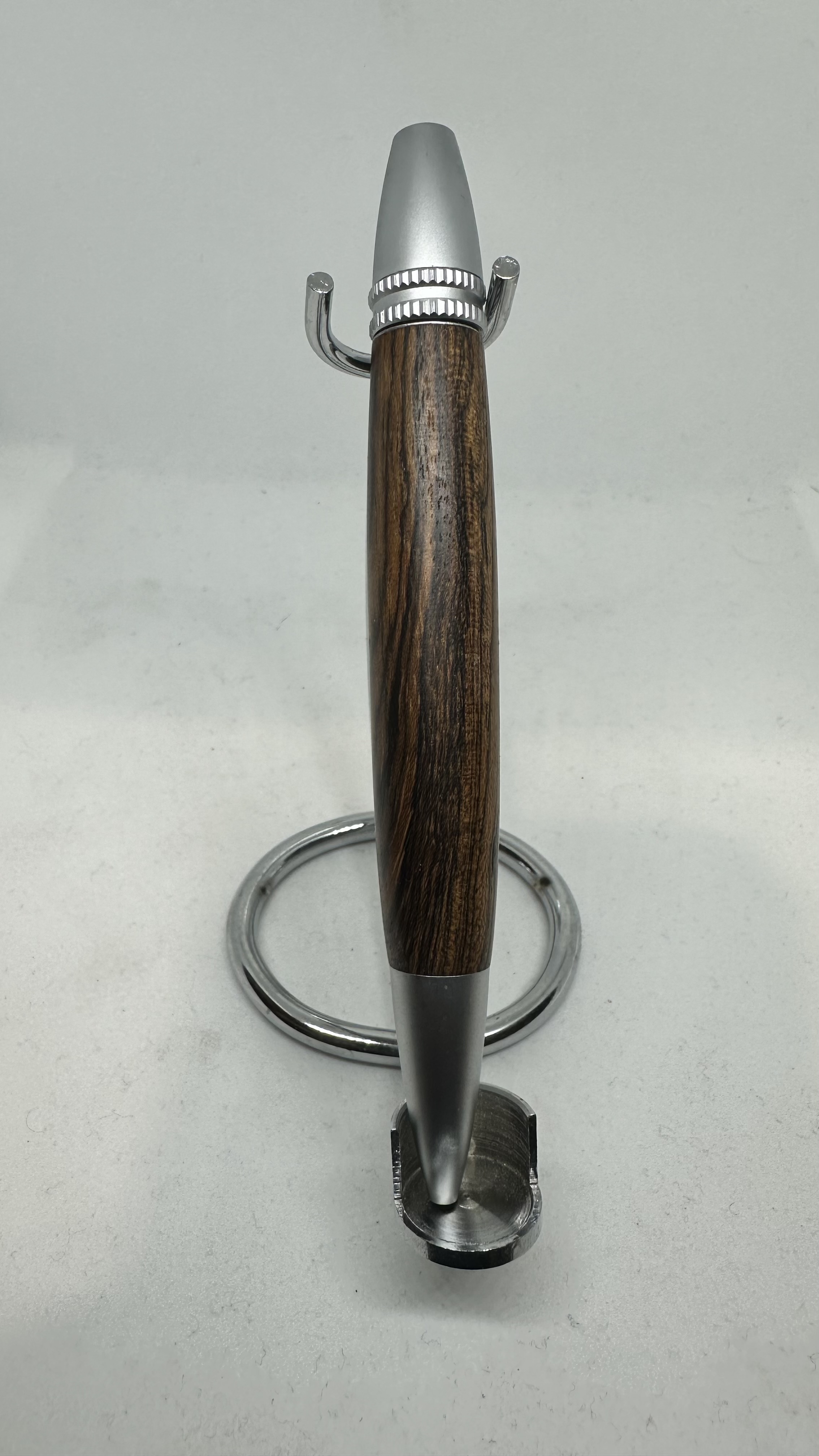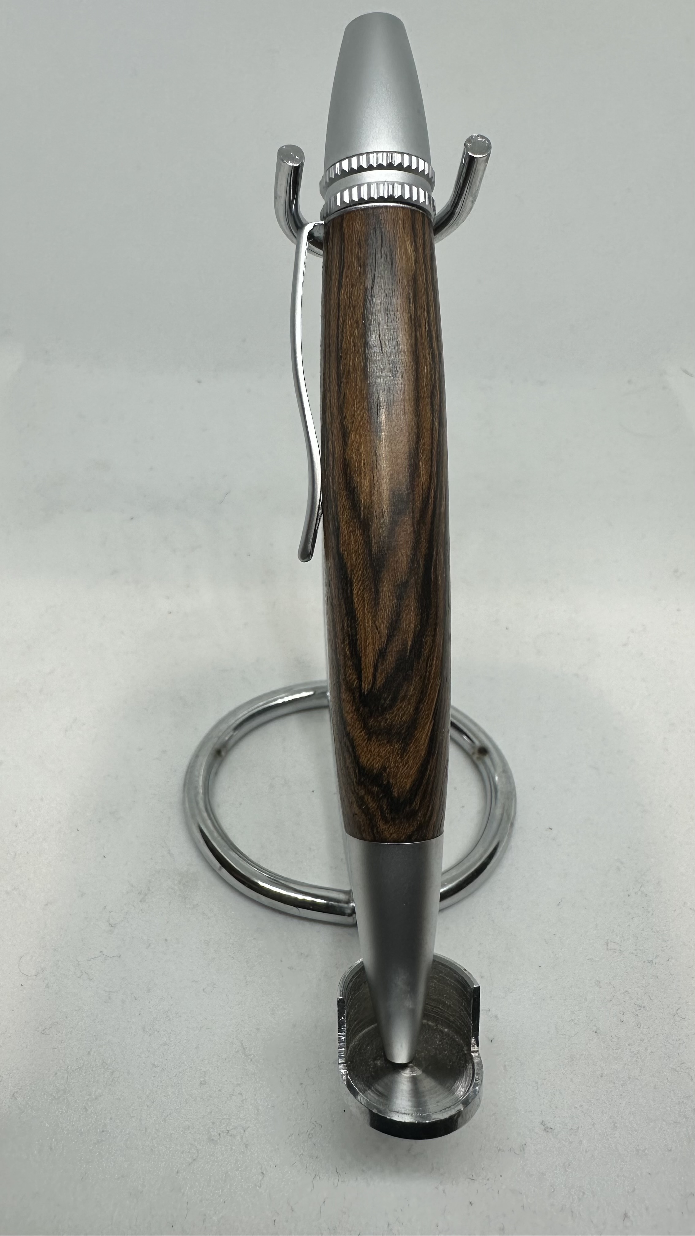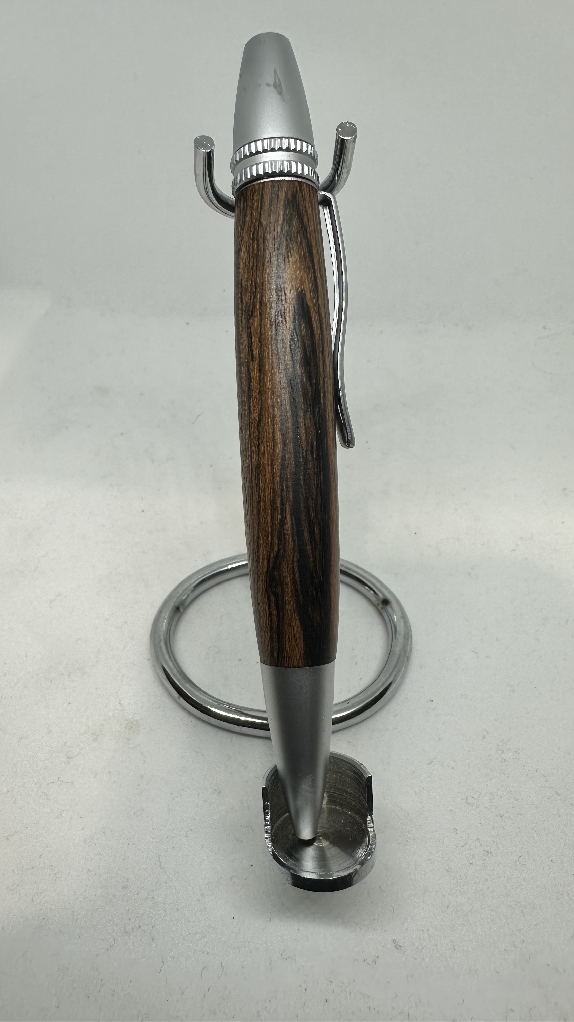 Handmade pen, has twist style mechanism and uses ball point refills. Accepts most Parker style refills. Made from Bocote hardwood.